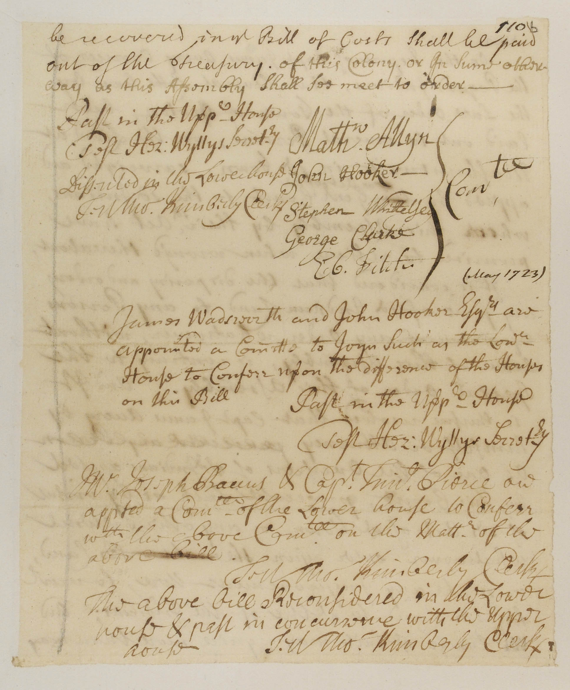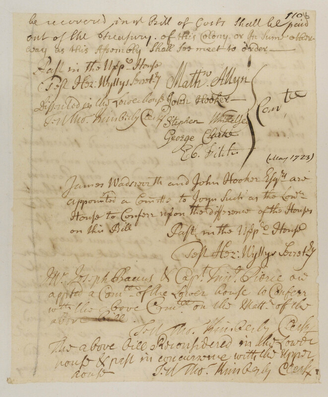 Avery, James (Mentioned within document); Backus, Joseph (Mentioned within document); Connecticut General Assembly (Recipient); Hooker, John, 1664-1746 (Mentioned within document); Kimberly, Thomas, 1681-1730 (Attestor); Pierce, Timothy (Mentioned within document); Wadsworth, James (Mentioned within document); Wyllys, Hezekiah, 1672-1741 (Attestor)