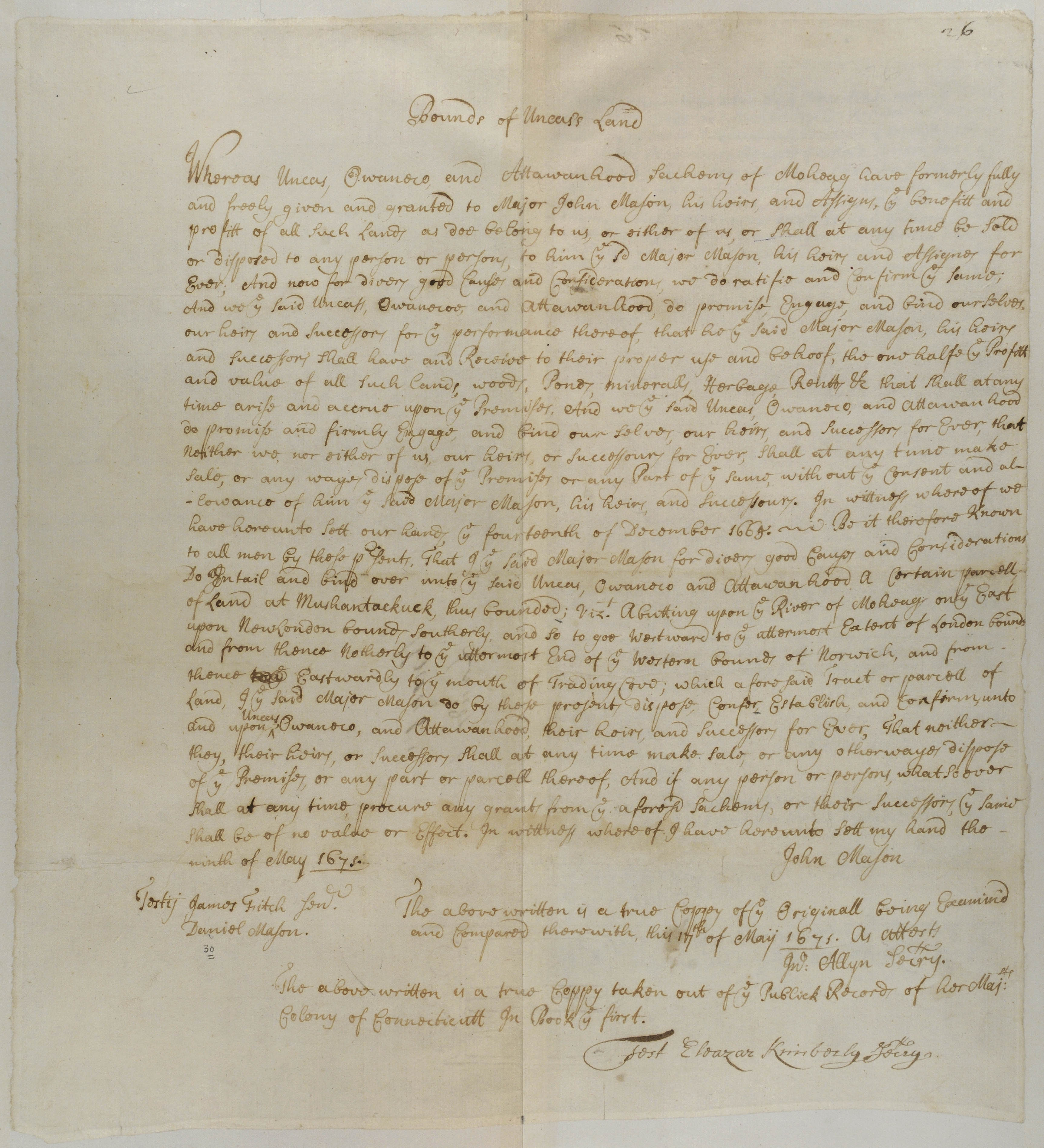 Allyn, John, 1631-1696 (Attestor); Attawanhood (Mentioned within document); Fitch, James, 1622-1702 (Attestor); Kimberly, Eleazar, 1639-1709 (Attestor); Mason, Daniel, 1652-1737 (Attestor); Mason, John, 1646-1676 (Mentioned within document); Owaneco, 1640- (Mentioned within document); Uncas, 1590-1683 (Mentioned within document)