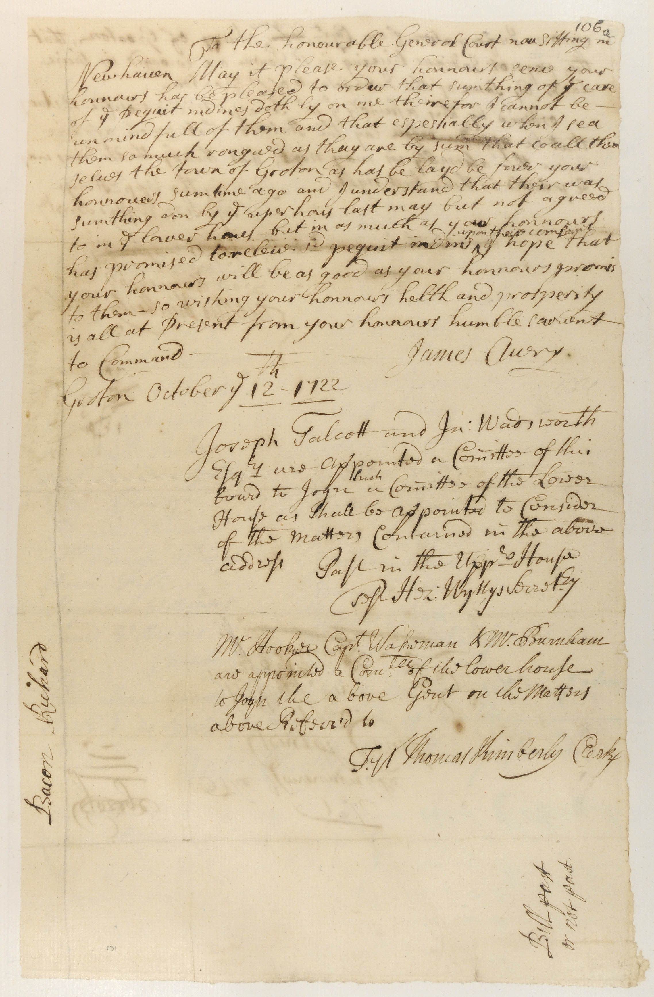 Avery, James (Mentioned within document); Bacon, Richard (Mentioned within document); Connecticut General Assembly (Recipient); Kimberly, Thomas, 1681-1730 (Attestor); Talcott, Joseph (Mentioned within document); Wadsworth, John (Mentioned within document); Wakeman, Joseph (Mentioned within document); Wyllys, Hezekiah, 1672-1741 (Attestor)