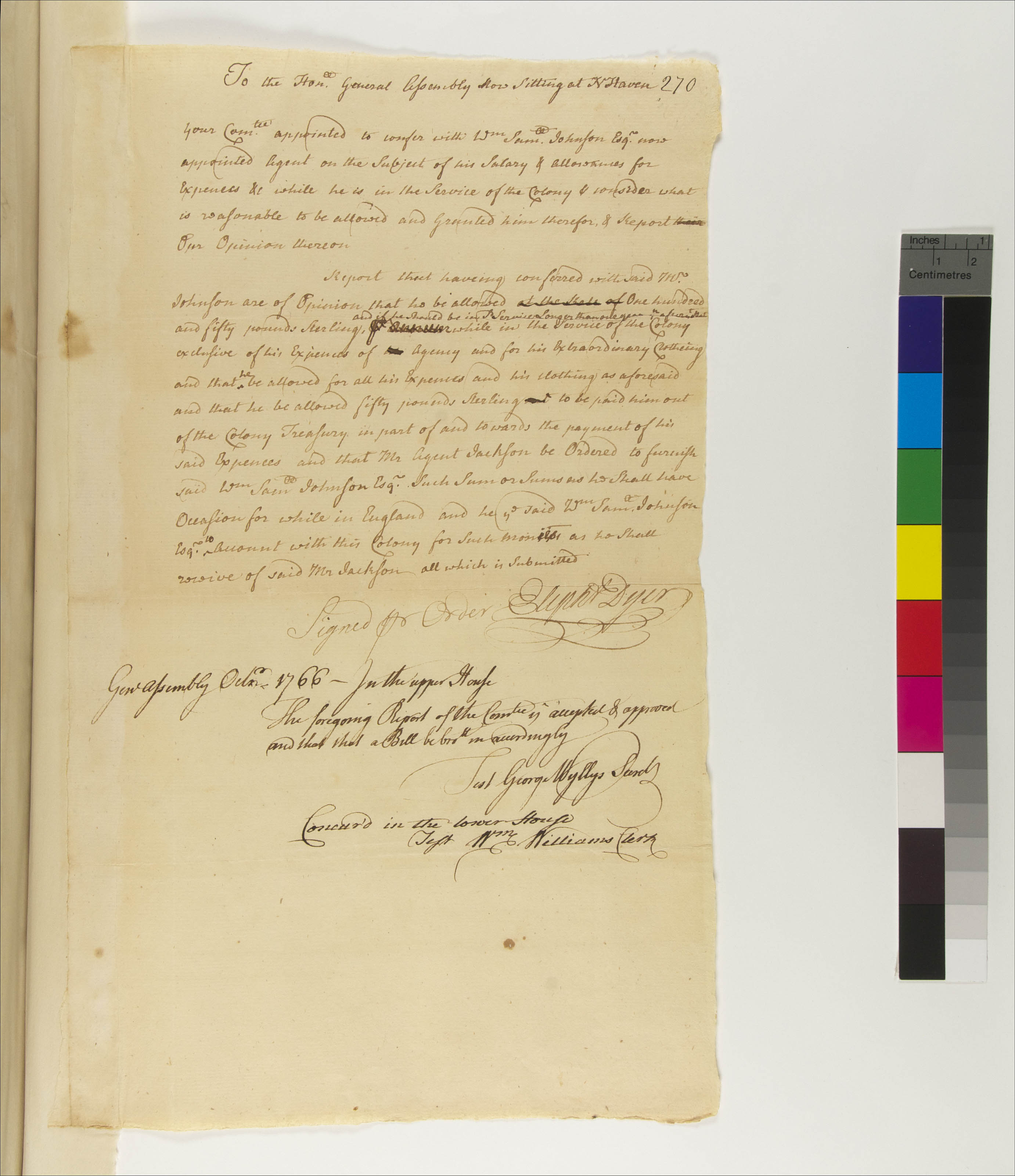 Government -- Colonial -- Colony of Connecticut -- Agents; Government -- Colonial -- Colony of Connecticut -- General Assembly -- Committees; Government -- Colonial -- Colony of Connecticut -- General Assembly; Government -- Imperial -- Agencies -- Privy Council; Government -- Tribal -- Mohegan -- Mason Faction -- Sachems/Sagamores -- John Uncas (1736-c.1769); Government -- Tribal -- Mohegan -- Pro-Government Faction -- Sachems/Sagamores -- Ben Uncas III (1746-1769); Land -- Complaints -- Controversies -- Mohegan Case; Law -- Attorneys/Solicitors/Barristers -- Fees; Law -- Imperial Actions -- Case Names -- Mohegan Case; Law -- Legislative Process -- Reports -- Accepted; Relations -- Colonial Affairs; Relations -- Imperial Affairs; Relations -- Tribal Affairs; Repository -- Connecticut State Library; Tribes/Communities -- Mohegan; YIPP -- Colony of Connecticut Collection, 1603-1783