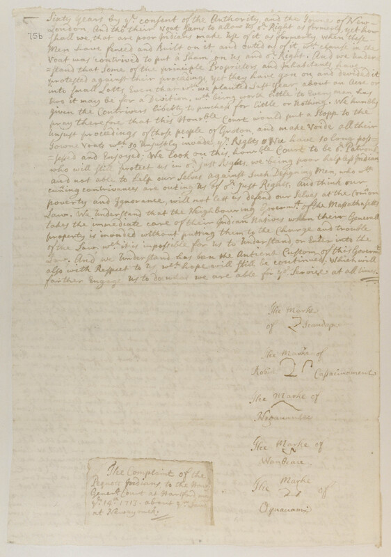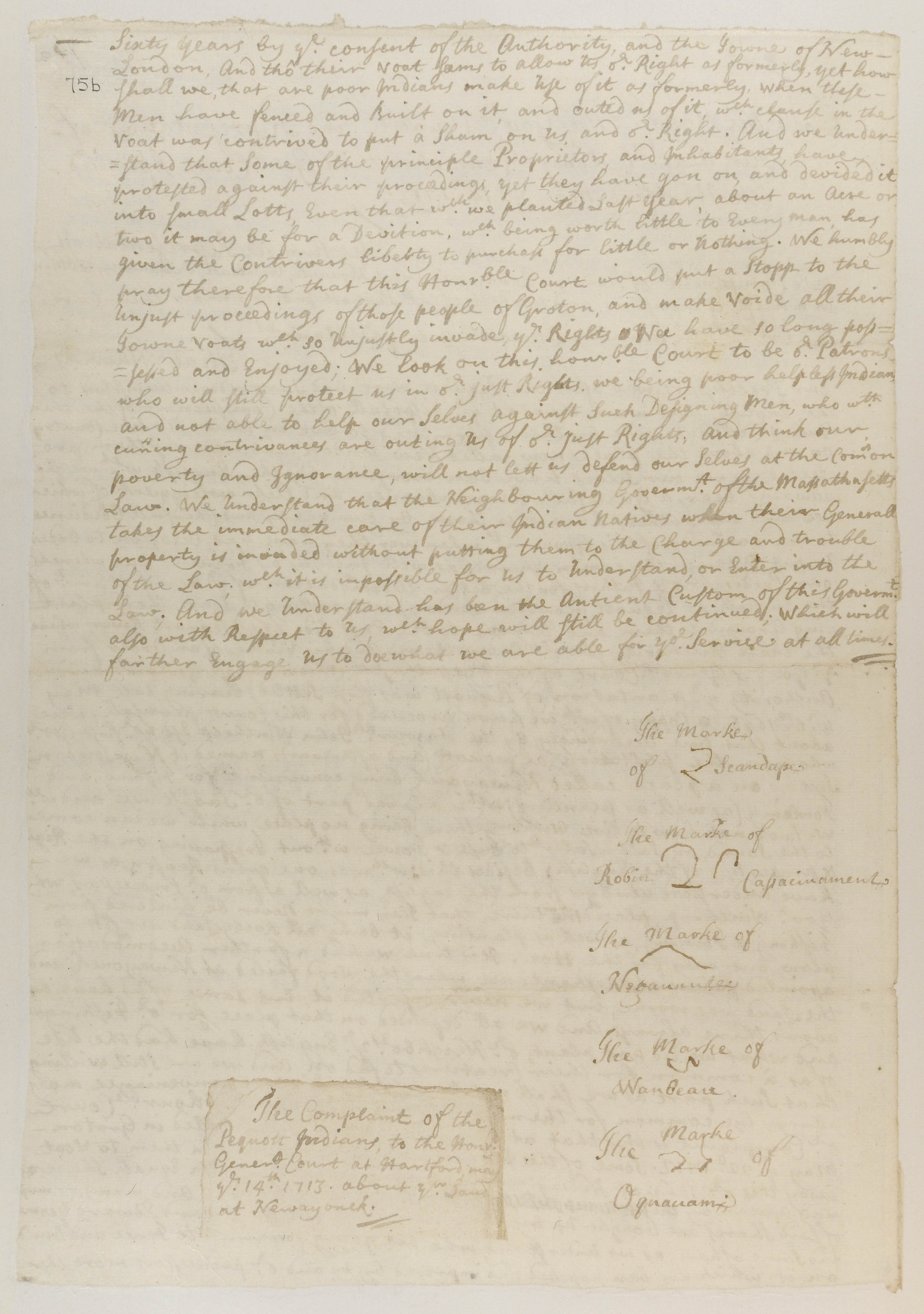 Buildings/Structures -- Houses; Culture -- Fishing/Hunting; Government -- Colonial -- Colony of Connecticut -- Towns -- Groton; Government -- Colonial -- Colony of Connecticut; Government -- Colonial -- Massachusetts Bay Colony; Government -- Tribal -- Pequot -- Western -- Sachems/Sagamores -- Robin Cassasinamon II ( -1722); Government -- Tribal -- Pequot -- Western -- Sachems/Sagamores -- Scadoab (1694-possibly c. 1725); Land -- Complaints -- Encroachment -- Neighbors; Land -- Complaints; Land -- Conveyances; Land -- Reservation/Reserve -- Pequot -- Western; Land -- Use -- Hunting/Fishing/Fowling; Land -- Use -- Improvement -- Agriculture; Land -- Use -- Improvement -- Building; Land -- Use -- Improvement -- Fences; Land -- Use -- Timber/Firewood; Landforms -- Aquatic -- Rivers -- Thames; Law -- Legislative Process -- Petitions; Law -- Treaties; Military -- Conquest; Military -- War -- Pequot War (1636-1638); Military -- War -- Treaties; Relations -- Colonial Affairs; Relations -- Tribal Affairs; Tribes/Communities -- Pequot -- Western; YIPP -- Colony of Connecticut Collection, 1603-1783