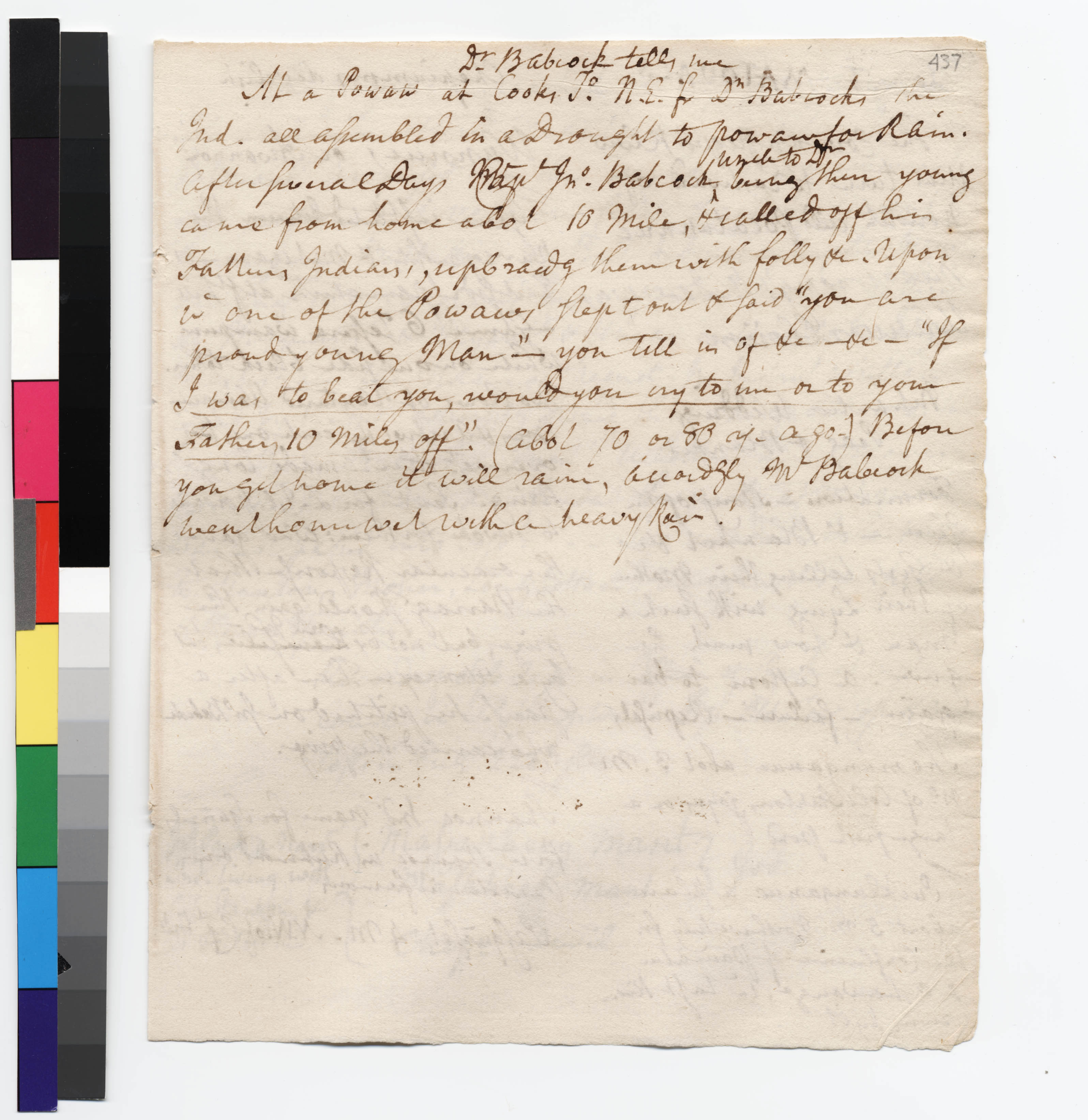 Culture -- Powwows; Culture -- Rites/Ceremonies; Relations -- Colonial Affairs; Relations -- Tribal Affairs; Repository -- Yale University -- Beinecke Library; Tribes/Communities -- Narragansett; Tribes/Communities -- Niantic -- Eastern; Weather; YIPP -- Colony of Rhode Island Collection, 1600-1783