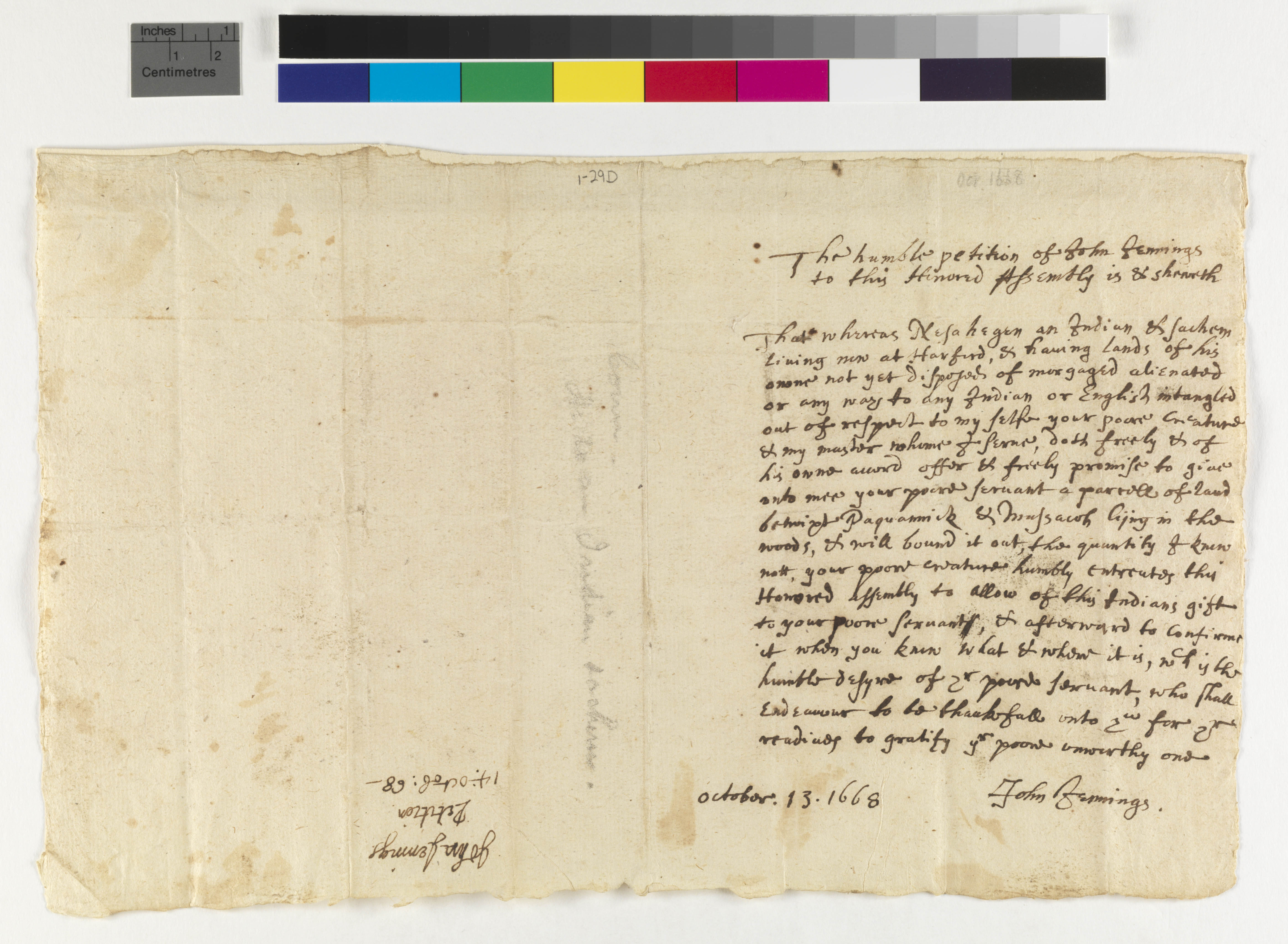 Government -- Colonial -- Colony of Connecticut -- General Assembly; Government -- Tribal -- Hartford Indians; Land -- Conveyances -- Gift; Land -- Reservation/Reserve -- Hartford Indians; Law -- Legislative Process -- Petitions; Relations -- Colonial Affairs; Relations -- Tribal Affairs; Repository -- Connecticut Historical Society; YIPP -- Colony of Connecticut Collection, 1603-1783