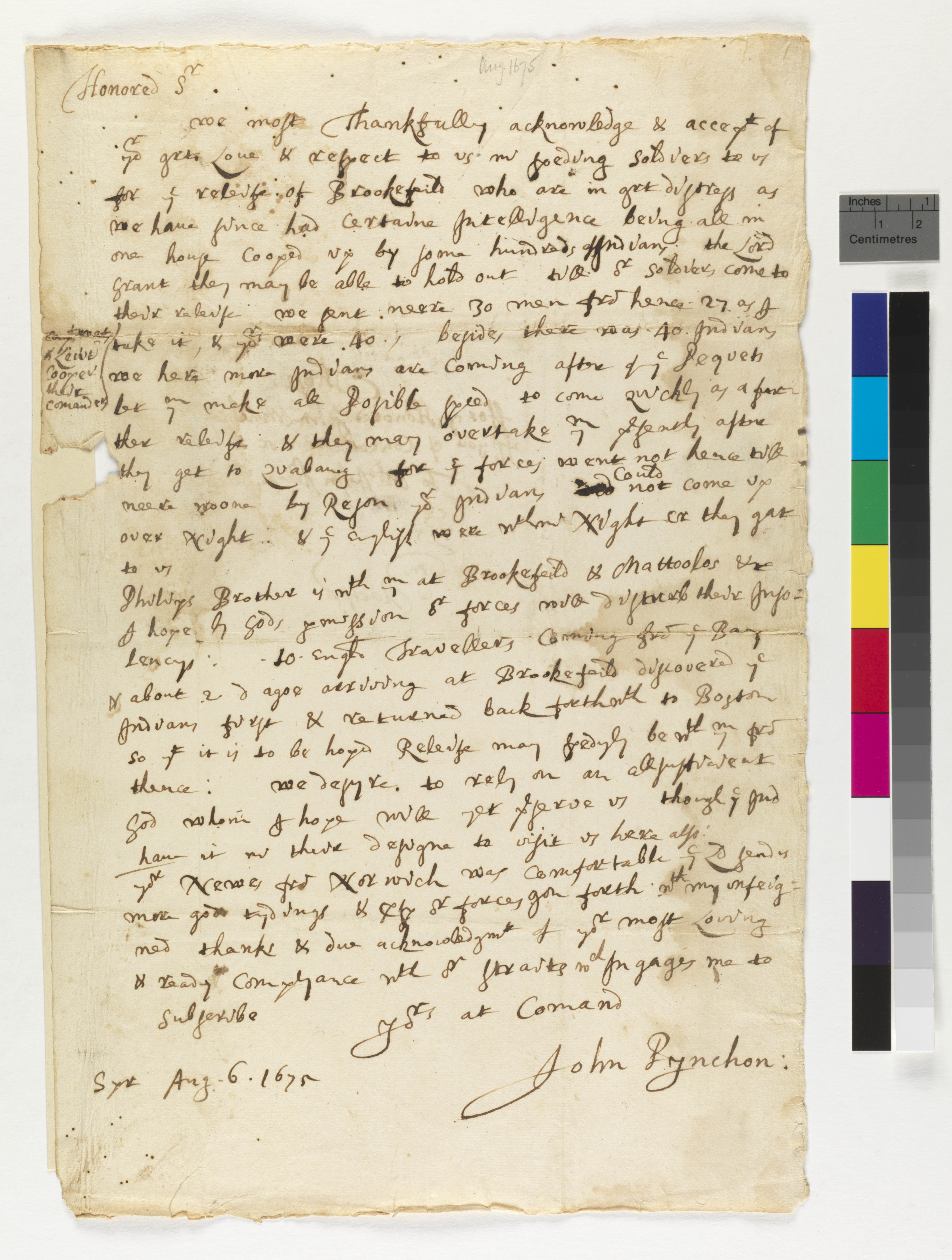 Allyn, John, 1631-1696 (Recipient); Anawan (Mentioned within document); Metacom (Mentioned within document); Winthrop, John, Jr. (Gov. CT), 1606-1676 (Recipient)