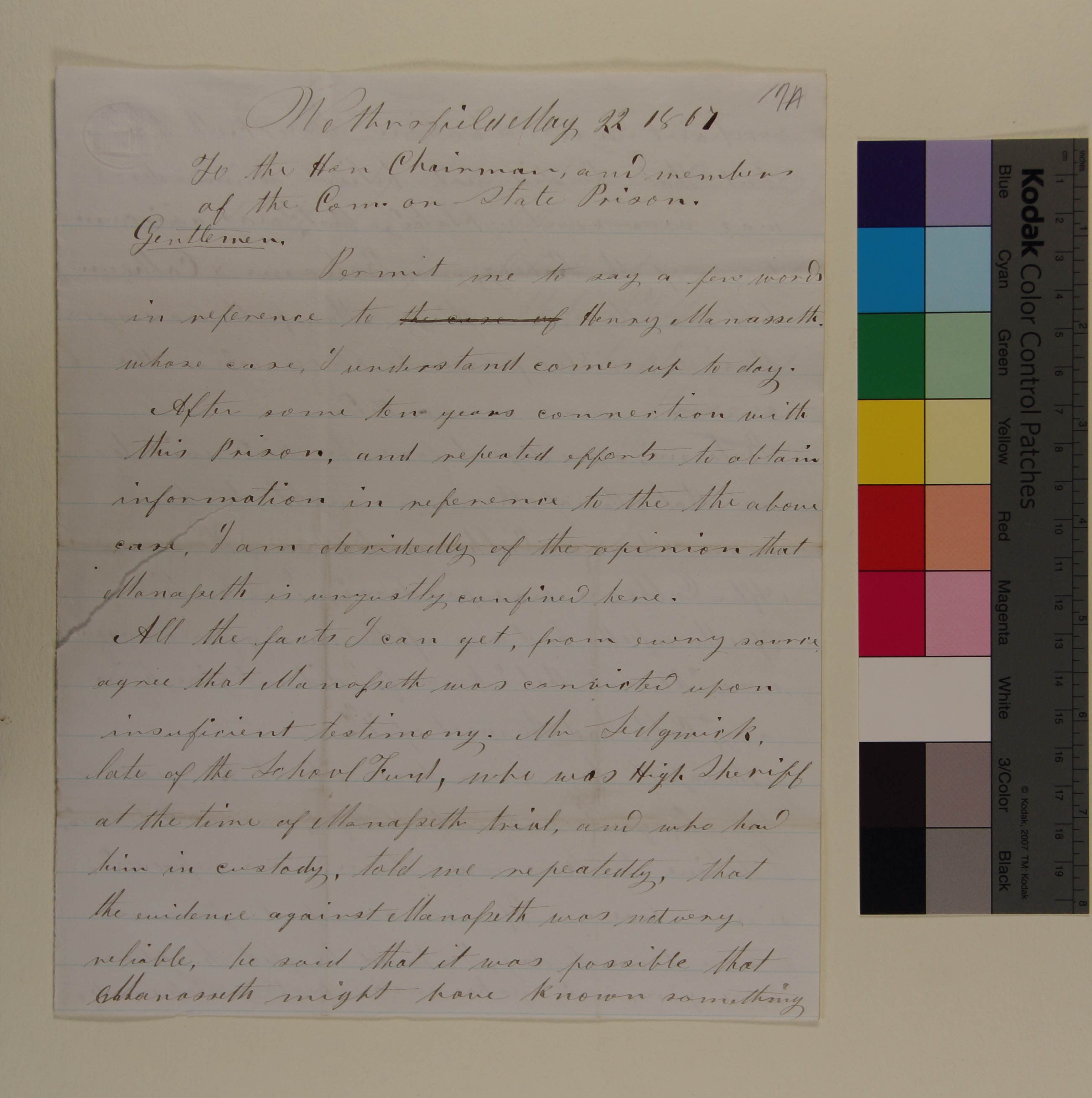Letter of B.C. Phelps to the Connecticut General Assembly on behalf of Henry Manasseth