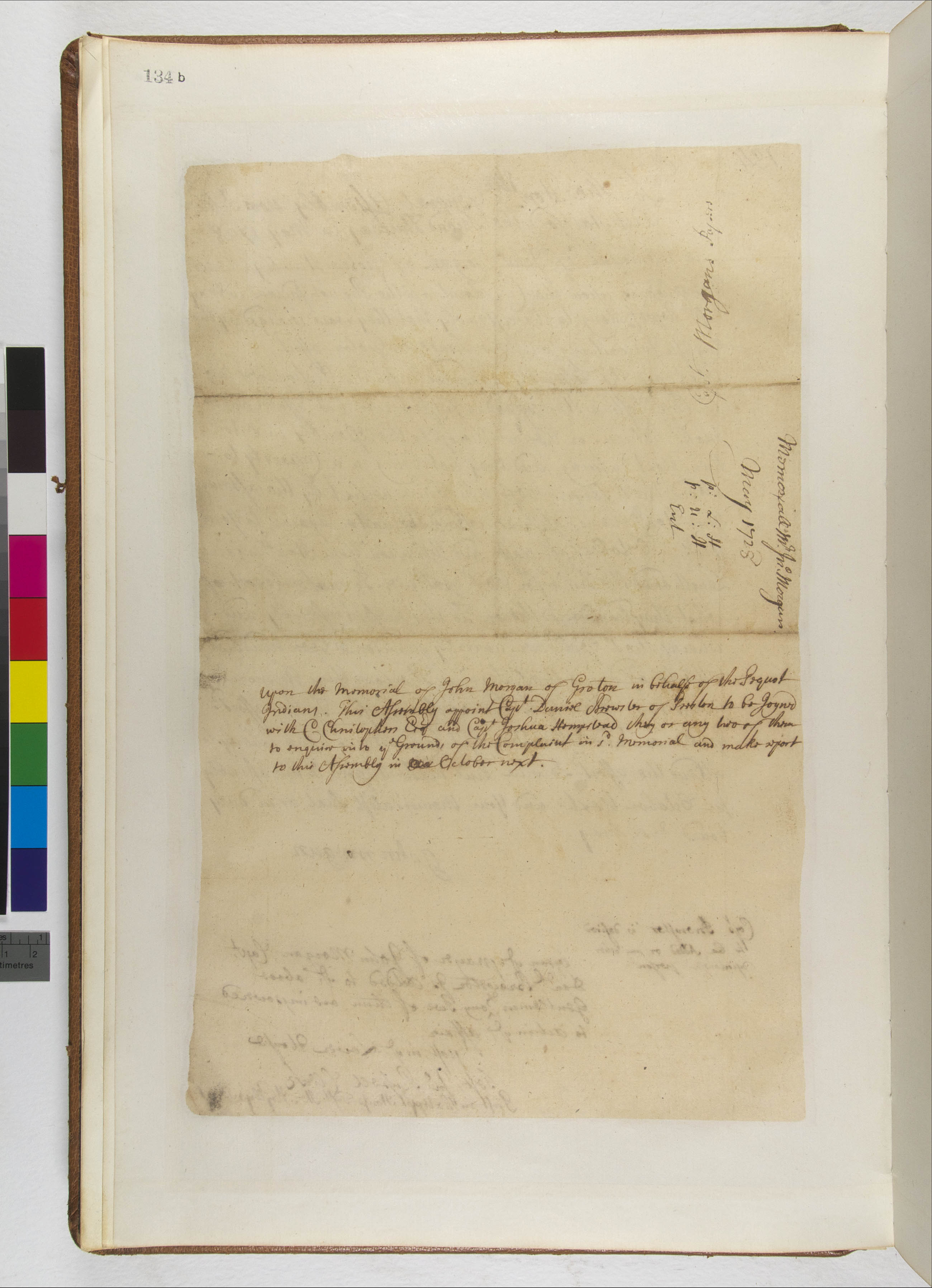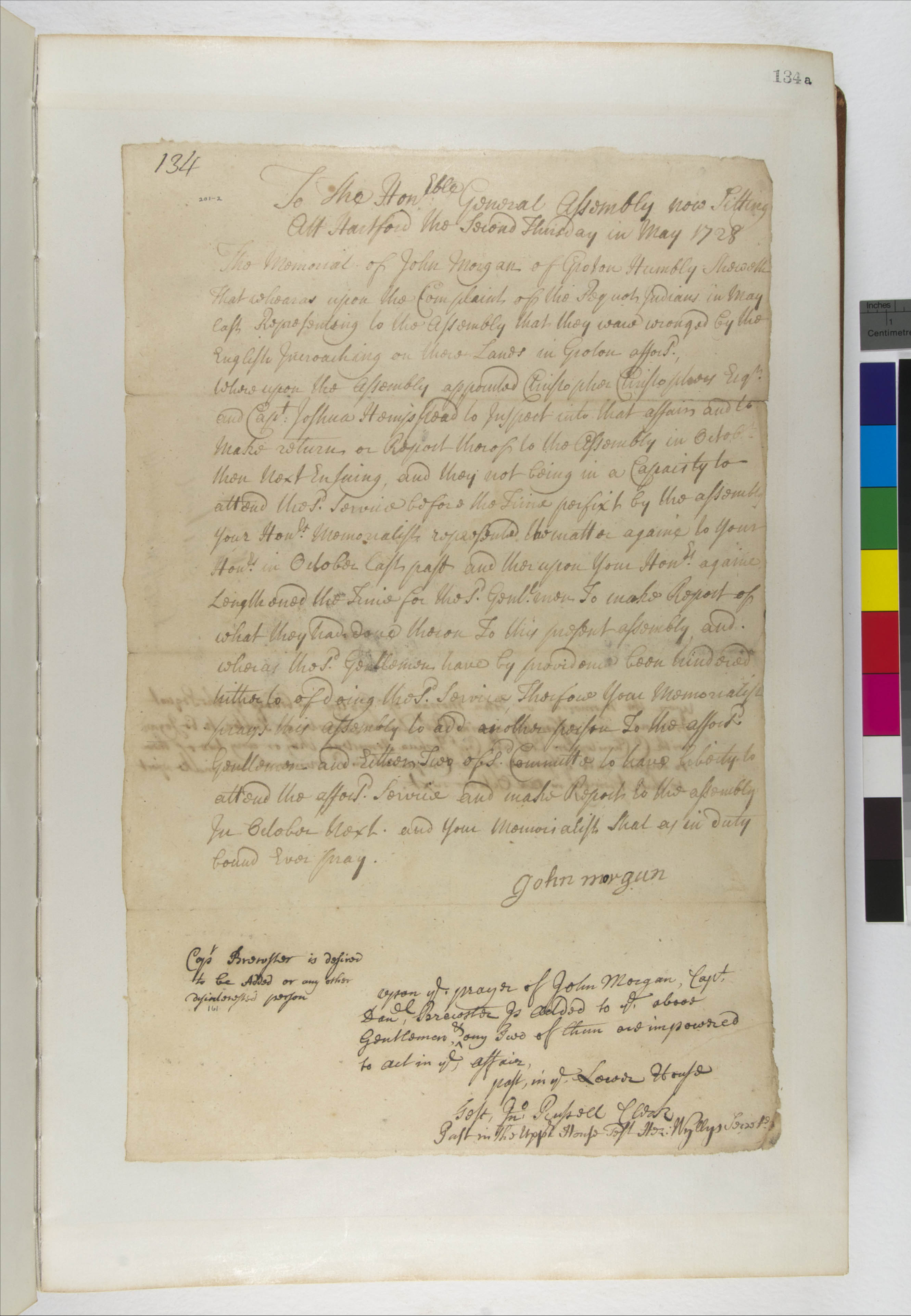 Brewster, Daniel (Mentioned within document); Christophers, Christopher (Mentioned within document); Connecticut General Assembly (Recipient); Hempstead, Joshua (Mentioned within document); Morgan, John (Captain) (Mentioned within document); Russell, John, 1687-1757 (Attestor); Wyllys, Hezekiah, 1672-1741 (Attestor)