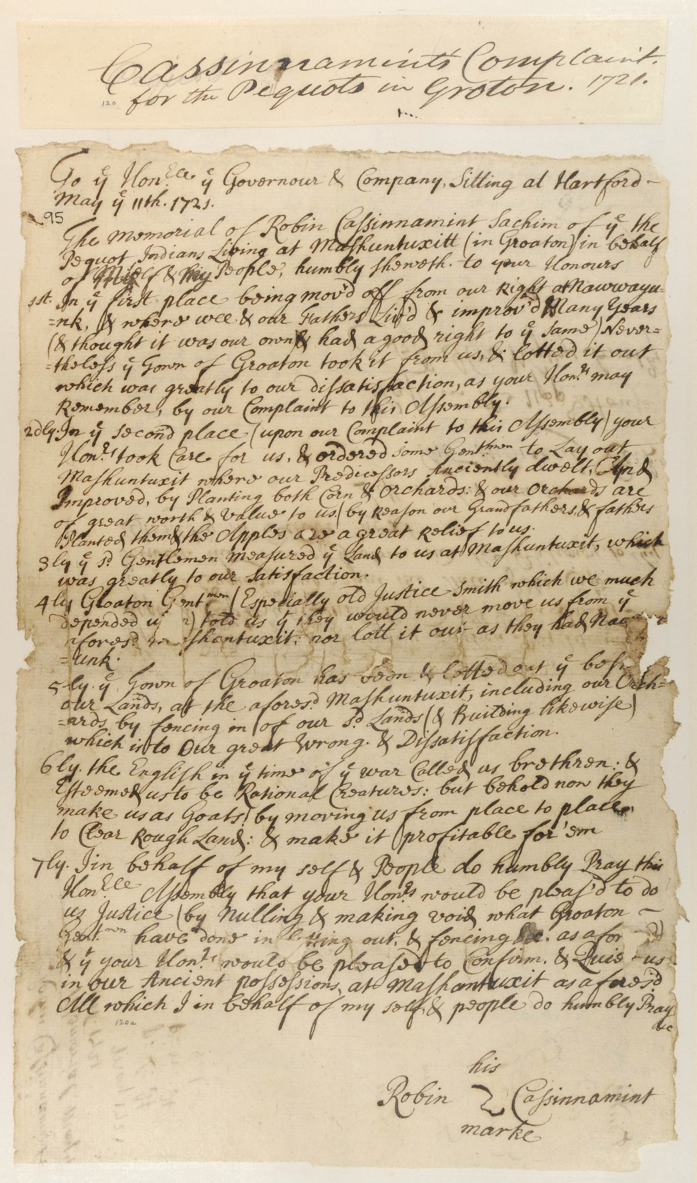 Buildings/Structures -- Houses; Culture -- Family; Government -- Colonial -- Colony of Connecticut -- Towns -- Groton; Government -- Colonial -- Colony of Connecticut; Government -- Tribal -- Pequot -- Western -- Sachems/Sagamores -- Robin Cassasinamon II ( -1722); Land -- Complaints -- Encroachment; Land -- Complaints; Land -- Reservation/Reserve -- Pequot -- Western; Land -- Use -- Improvement -- Agriculture; Land -- Use -- Improvement -- Orchards; Law -- Legislative Process -- Petitions -- Accepted; Tribes/Communities -- Pequot -- Western; YIPP -- Colony of Connecticut Collection, 1603-1783