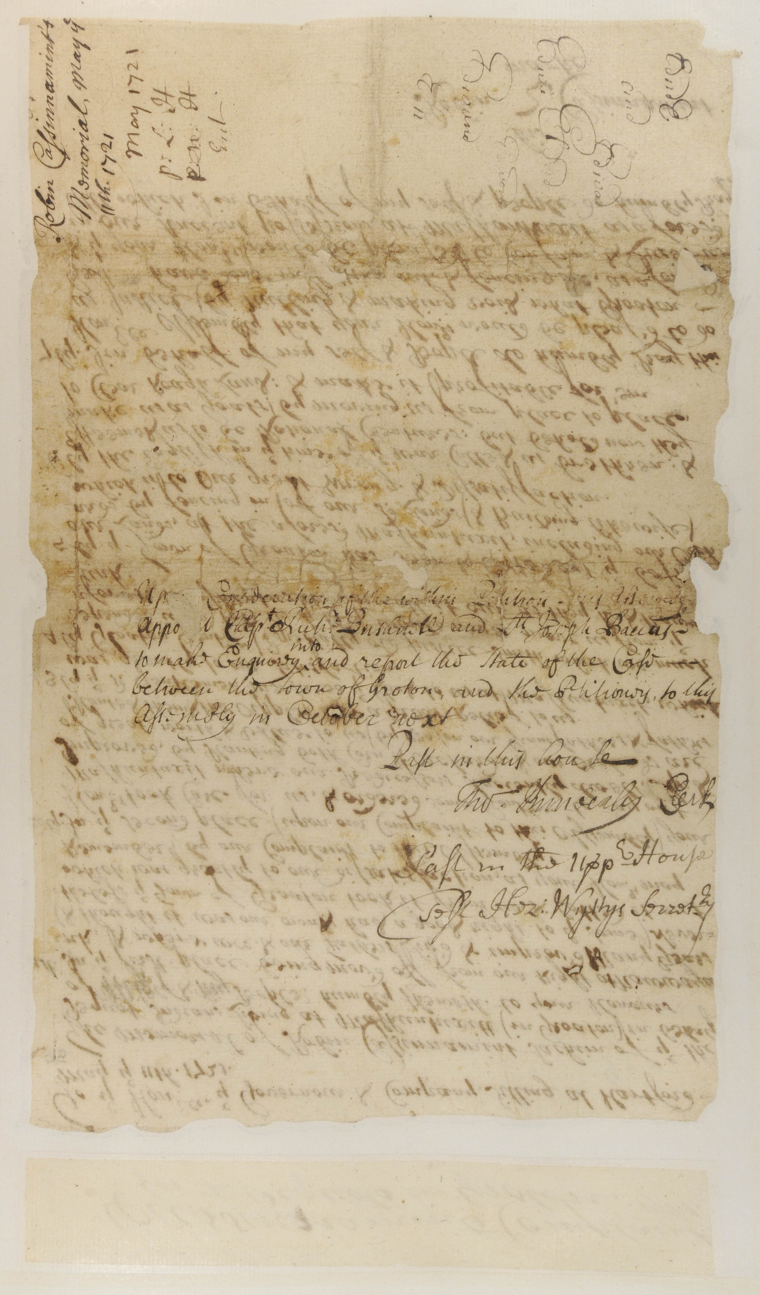 Backus, Joseph (Mentioned within document); Bushnell, Richard (Mentioned within document); Cassasinamon, Robin, -1722 (Mentioned within document); Connecticut General Assembly (Recipient); Kimberly, Thomas, 1681-1730 (Attestor); Smith, Nehemiah, Sr (Mentioned within document); Wyllys, Hezekiah, 1672-1741 (Attestor)
