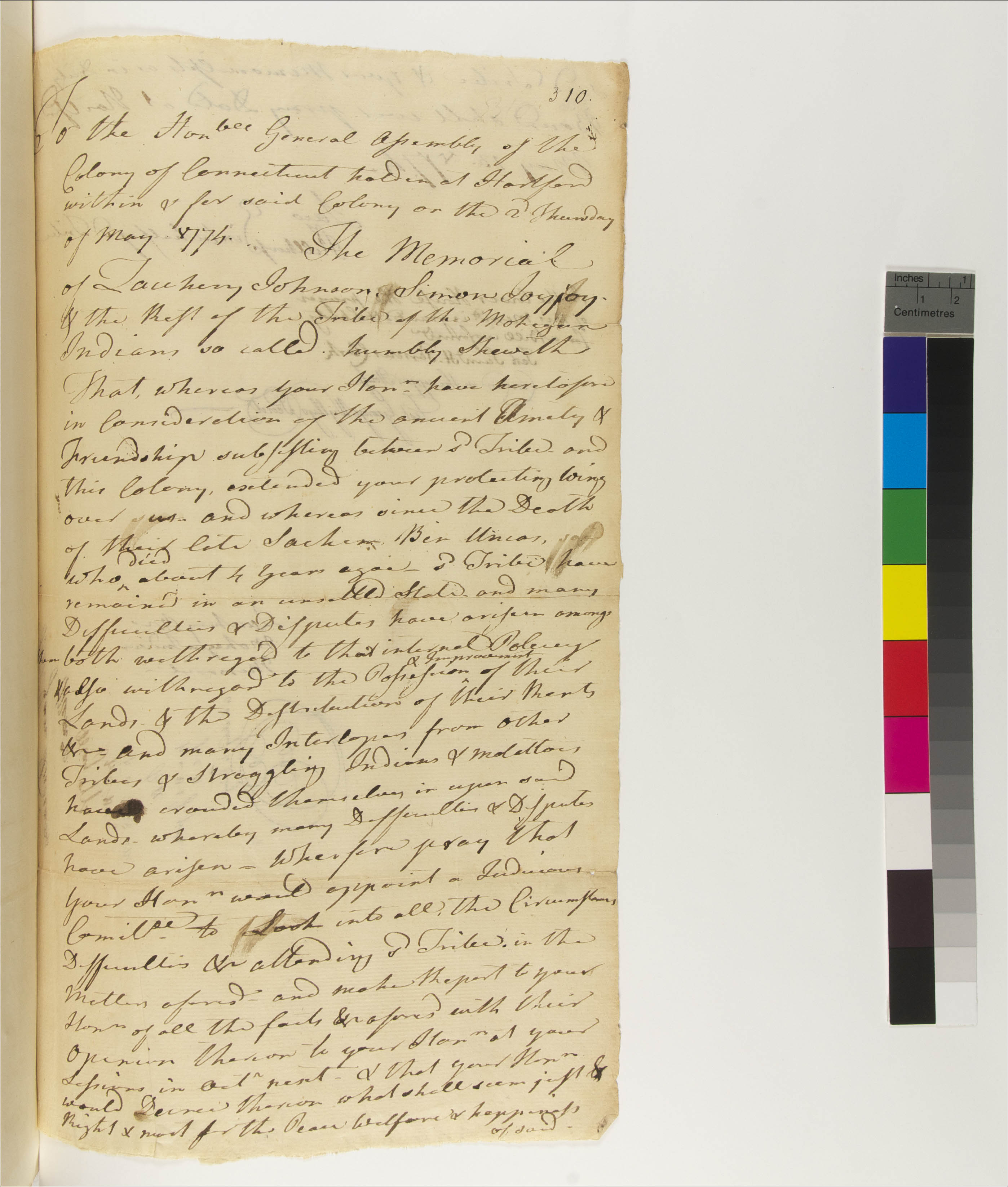 Abstract Ideas -- Friend Indians; Abstract Ideas -- Peace & Friendship; Culture -- Disputes; Disease/Illness -- Deaths; Government -- Colonial -- Colony of Connecticut -- General Assembly -- Committees; Government -- Colonial -- Colony of Connecticut -- General Assembly; Government -- Tribal -- Mohegan -- Pro-Government Faction -- Councilors -- Zachary Johnson (c.1769-1783+); Government -- Tribal -- Mohegan -- Pro-Government Faction -- Sachems/Sagamores -- Ben Uncas III (1746-1769); Land -- Complaints; Land -- Rental; Land -- Reservation/Reserve -- Mohegan; Land -- Use -- Improvement; law -- Attorneys/Solicitors/Barristers; Law -- Legislative Process -- Appointment; Law -- Legislative Process -- Petitions -- Accepted; Race -- African/Black; Race -- Mixed; Race -- Native American; Relations -- Colonial Affairs; Relations -- Tribal Affairs; Repository -- Connecticut State Library; Tribes/Communities -- Mohegan; Tribes/Communities -- Unknown/Foreign; YIPP -- Colony of Connecticut Collection, 1603-1783