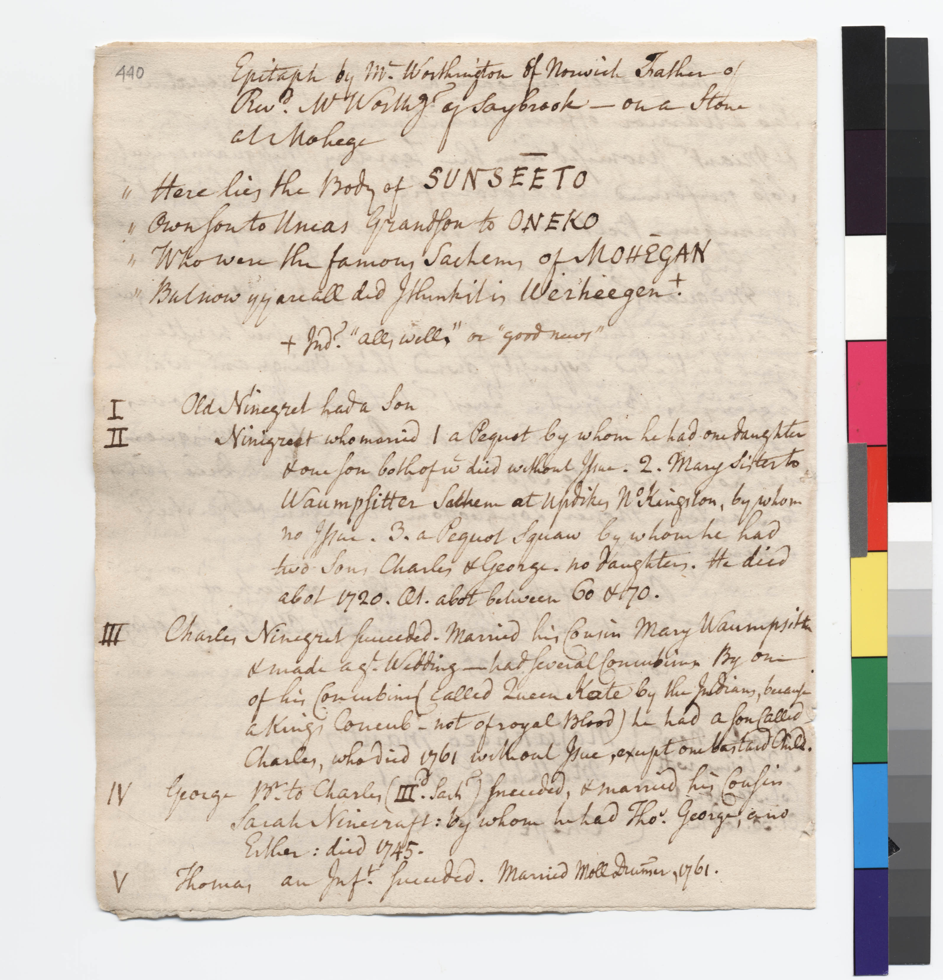 Culture -- Burials -- Stone Markers; Culture -- Children; Culture -- Family -- Kinship; Culture -- Family -- Marriages; Culture -- Family; Culture -- Genealogy; Genealogy; Government -- Tribal -- Mohegan -- Sachems/Sagamores -- Uncas (1638-1683); Government -- Tribal -- Narragansett -- Sachems/Sagamores -- Ninigret (1637-1677); Government -- Tribal -- Narragansett -- Sachems/Sagamores -- Thomas Ninigret (1746-1770); Government -- Tribal -- Narragansett; Land -- Reservation/Reserve -- Mohegan; Language -- Algonquian -- Eastern -- Pequot/Mohegan; Repository -- Yale University -- Beinecke Library; Tribes/Communities -- Mohegan; Tribes/Communities -- Narragansett; Tribes/Communities -- Niantic -- Eastern; Vital Records -- Births; Vital Records -- Deaths; Vital Records -- Marriages; YIPP -- Colony of Connecticut Collection, 1603-1783; YIPP -- Colony of Rhode Island Collection, 1600-1783