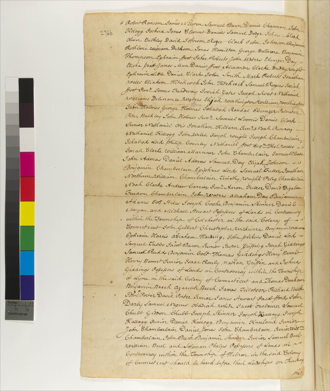 Adams, Benjamin (Mentioned within document); Adams, Daniel (Mentioned within document); Adams, John (Mentioned within document); Allyn, Jason (Mentioned within document); Allyn, Samuel (Mentioned within document); Atwell, Joseph (Mentioned within document); Avery, Abner (Mentioned within document); Avery, Abraham (Mentioned within document); Avery, Samuel (Mentioned within document); Bacon, Broadhurst (Mentioned within document); Bacon, Jacob, Jr (Mentioned within document); Baker, Gideon (Mentioned within document); Baker, James (Mentioned within document); Baker, Joshua (Mentioned within document); Beech, Azariah (Mentioned within document); Beech, Benjamin (Mentioned within document); Beech, John (Mentioned within document); Beech, Richard (Mentioned within document); Bennet, Henry (Mentioned within document); Bennet, Henry, Jr. (Mentioned within document); Bigalow, David (Mentioned within document); Bradford, Joseph, Jr. (Mentioned within document); Brown, Daniel (Mentioned within document); Brown, Samuel (Mentioned within document); Buel, Samuel (Mentioned within document); Buel, William (Mentioned within document); Bulkeley, Oliver (Mentioned within document); Bulkeley, Peter (Mentioned within document); Bulkley, Charles (Mentioned within document); Bulkley, John (Mentioned within document); Button, Peter (Mentioned within document); Carrier, Andrew, Jr. (Mentioned within document); Cascaddin, William (Mentioned within document); Chamberlain, Benjamin (Mentioned within document); Chamberlain, Freedom (Mentioned within document); Chamberlain, John (Mentioned within document); Chamberlain, John, Jr. (Mentioned within document); Chamberlain, Joseph (Mentioned within document); Chamberlain, Pelege (Mentioned within document); Chamberlain, WIlliam (Mentioned within document); Chapman, Daniel (Mentioned within document); Chapman, John (Mentioned within document); Chapman, Robert (Mentioned within document); Chappel, Eleazer (Mentioned within document); Chubb, Gideon (Mentioned within document); Chubb, Samuel (Mentioned within document); Clark, Alexander (Mentioned within document); Clark, Daniel, Jr. (Mentioned within document); Clark, John (Mentioned within document); Clark, Jonah (Mentioned within document); Clark, Noah (Mentioned within document); Clark, Roger (Mentioned within document); Clarke, Daniel (Mentioned within document); Collett, Thomas (Mentioned within document); Colt, Benjamin (Mentioned within document); Cook, Joseph (Mentioned within document); Copp, David (Mentioned within document); Copp, John (Mentioned within document); Copp, Jonathan (Mentioned within document); Copp, Samuel (Mentioned within document); Coverly, Philip (Mentioned within document); Daniels, Clement (Mentioned within document); Daniels, Jonathan (Mentioned within document); Darby, John (Mentioned within document); Darrow, Christopher (Mentioned within document); Day, Abraham (Mentioned within document); Day, Ebenezer (Mentioned within document); Day, Samuel (Mentioned within document); Denison, Robert (Mentioned within document); Dickson, William (Mentioned within document); Dodge, David (Mentioned within document); Dodge, Isaac (Mentioned within document); Dodge, Samuel (Mentioned within document); Dolbear, George (Mentioned within document); Dunham, Thomas (Mentioned within document); Fitch, Adonijah (Mentioned within document); Fitch, Daniel (Mentioned within document); Foot, Ephraim (Mentioned within document); Foot, Josiah, Jr. (Mentioned within document); Foot, Nathaniel (Mentioned within document); Ford, Jacob (Mentioned within document); Fox, Ezekiel (Mentioned within document); Fox, Samuel (Mentioned within document); Fuller, Aaron (Mentioned within document); Fuller, Samuel (Mentioned within document); Gardiner, Peregine (Mentioned within document); Gardiner, Stephen (Mentioned within document); Gates, Josiah (Mentioned within document); Giddings, Joseph (Mentioned within document); Giddings, Joshua (Mentioned within document); Giddings, Thomas (Mentioned within document); Griffin, Jasper (Mentioned within document); Griffin, Nathan (Mentioned within document); Hamilton, Jonas (Mentioned within document); Hammond, Isaac (Mentioned within document); Hammond, Noah (Mentioned within document); Harding, Abraham (Mentioned within document); Harris, Ephraim (Mentioned within document); Harris, James, 1673-1757 (Mentioned within document); Harris, James, Jr (Mentioned within document); Harris, Jonathan (Mentioned within document); Harris, Lebbeus, 1713- (Mentioned within document); Harris, William (Mentioned within document); Hewitt, Michael (Mentioned within document); Hill, George (Mentioned within document); Hill, John (Mentioned within document); Hitchcock, Eliakim (Mentioned within document); Hitchcock, John (Mentioned within document); Holmes, George (Mentioned within document); Holmes, John (Mentioned within document); Holmes, John, Jr. (Mentioned within document); Jewett, David, 1714-1783 (Mentioned within document); Johnson, Daniel (Mentioned within document); Johnson, David (Mentioned within document); Johnson, Elijah (Mentioned within document); Johnson, John (Mentioned within document); Jones, Daniel (Mentioned within document); Jones, Isaac (Mentioned within document); Jones, Jabez (Mentioned within document); Jones, James (Mentioned within document); Jones, Joshua (Mentioned within document); Kellogg, Daniel (Mentioned within document); Kellogg, John (Mentioned within document); Kellogg, Joseph (Mentioned within document); Kellogg, Joseph, Jr. (Mentioned within document); Kellogg, Nathaniel (Mentioned within document); Kilbourn, Jonathan (Mentioned within document); Kilburn, Jonathan, Jr (Mentioned within document); Kneeland, Benjamin, Jr. (Mentioned within document); Lefevours, Goerge (Mentioned within document); Leffingwell, Samuel, Jr. (Mentioned within document); Lilly, Gilbert (Mentioned within document); Little, Ephraim (Mentioned within document); Loomis, Jacob (Mentioned wit