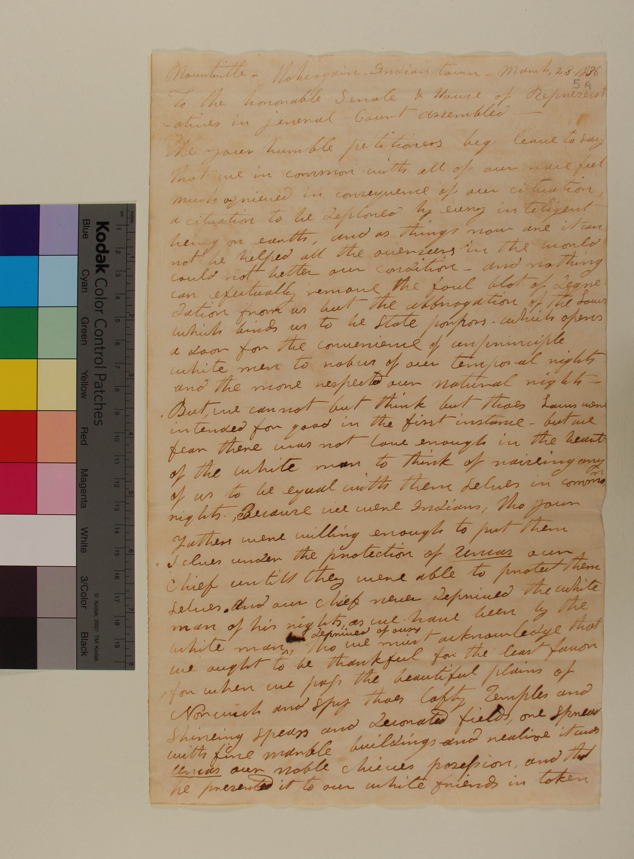 Abstract Ideas -- Dignity; Abstract Ideas -- Justice; Abstract Ideas -- Paternalism; Abstract Ideas -- Savageness; Abstract Ideas -- Sovereignty; Buildings/Structures -- School House; Culture -- Burials -- Stone Markers; Culture -- Citizenship; Education/Schools -- Missions; Education/Schools; Government -- State -- Connecticut -- General Assembly; Land -- Common -- Division; Land -- Conveyances -- Sale -- Request; Land -- Reservation/Reserve -- Mohegan; Law -- Legislative Process -- Petitions -- Rejected; Race -- African/Black; Tribes/Communities -- Cherokee; YIPP -- State of Connecticut Collection, 1784-1869