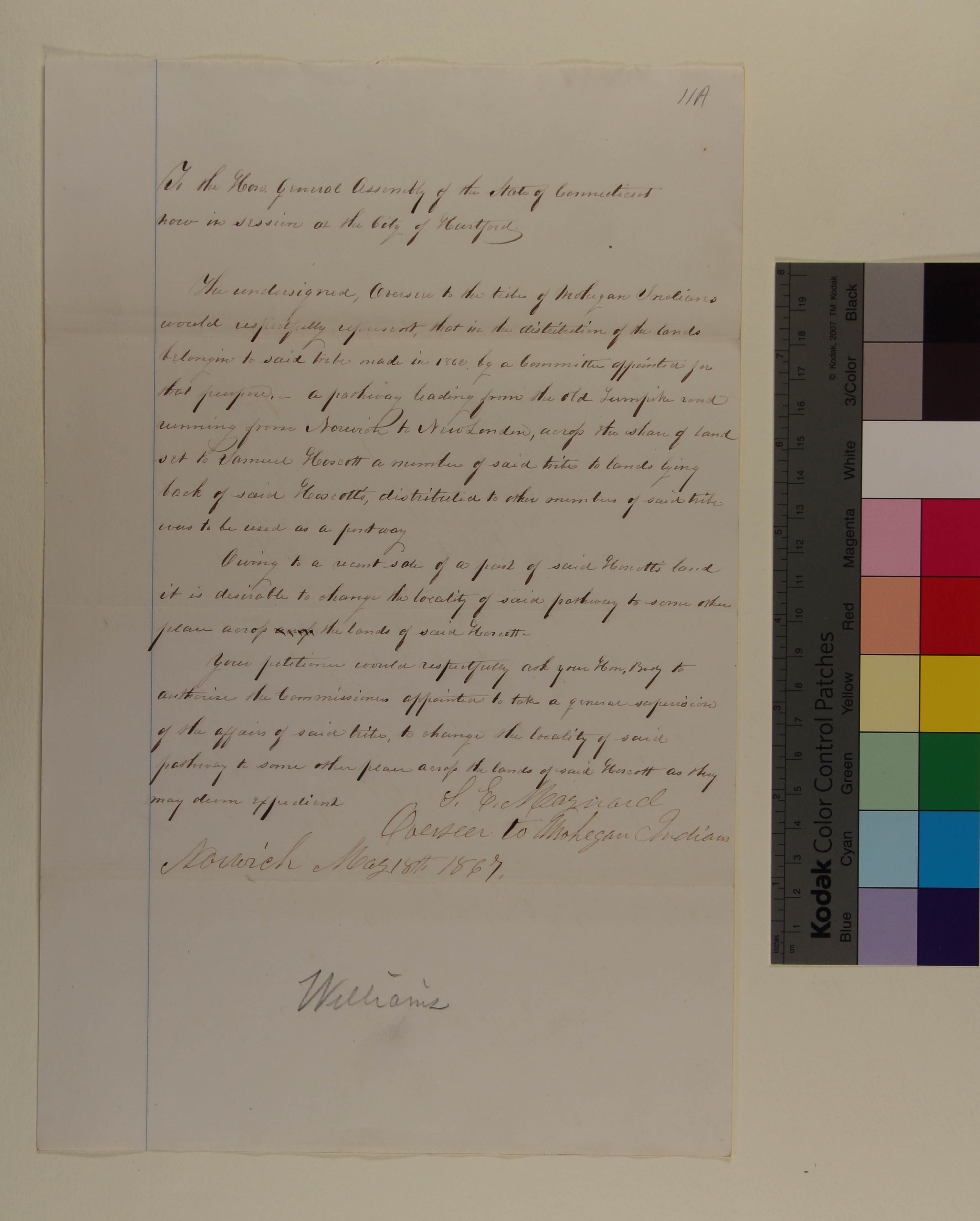 Petition of S.E. Maynard, Overseer for the Mohegan Indians, to the Connecticut General Assembly concerning a Road across Mohegan Lands