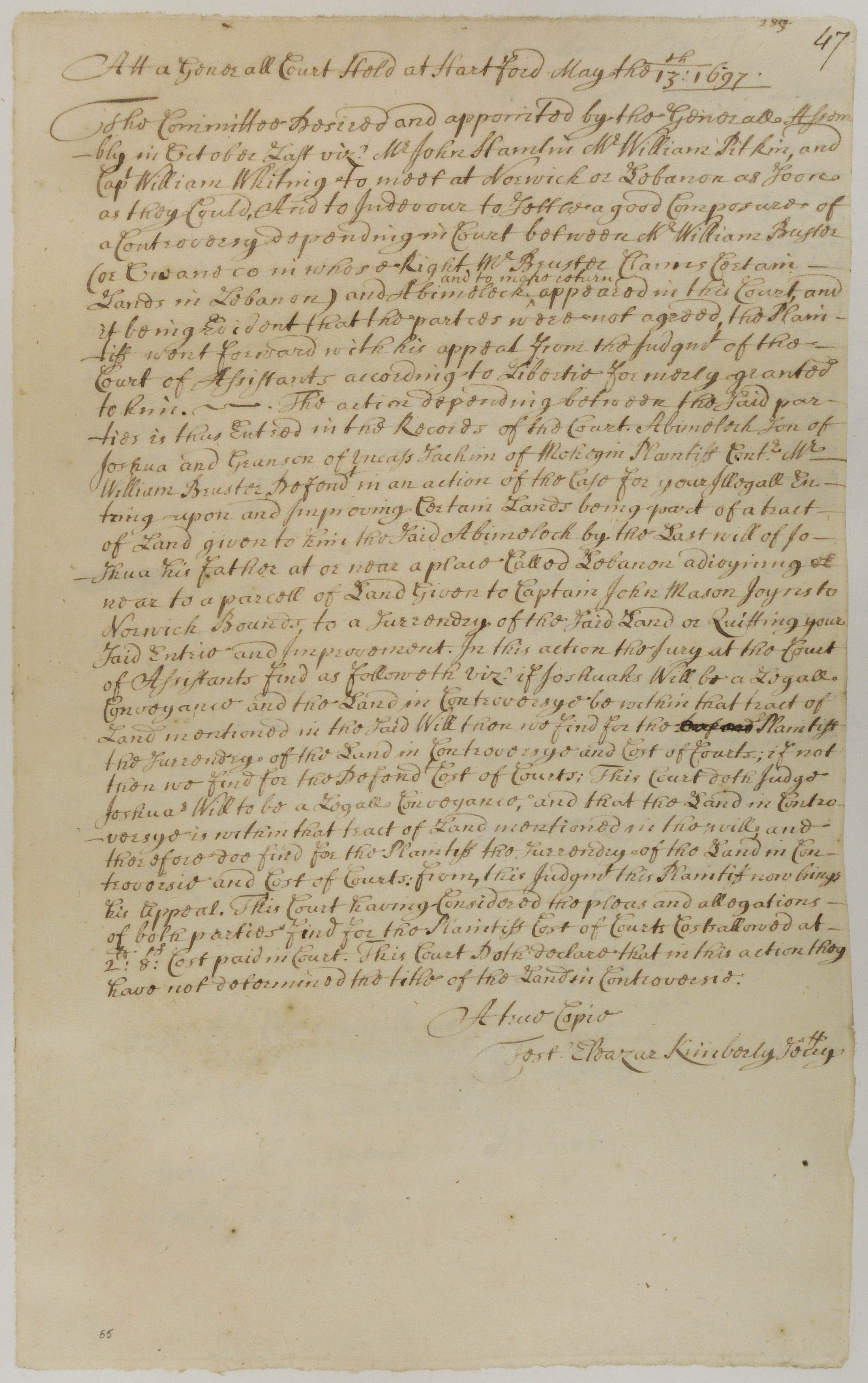 Abstract Ideas -- Land Ownership; Culture -- Inheritance; Genealogy; Government -- Colonial -- Colony of Connecticut; Government -- Tribal -- Mohegan -- Sachems/Sagamores -- Joshua Attawanhood; Government -- Tribal -- Mohegan -- Sachems/Sagamores -- Uncas (1638-1683); Land -- Complaints -- Controversies -- Mohegan Case; Land -- Complaints -- Encroachment; Land -- Conveyances -- Deed/Title; Land -- Conveyances -- Sale; Land -- Description -- Boundaries; Land -- Use -- Improvement; Law -- Civil Actions -- Case Names -- Abimileck v. Brewster; Law -- Civil Actions -- Procedure -- Appeals; Law -- Civil Actions -- Property Issues -- Trespass; Law -- Civil Actions -- Torts -- Trespass; Law -- Statutory Law -- Indians -- Land; Tribes/Communities -- Mohegan; YIPP -- Colony of Connecticut Collection, 1603-1783