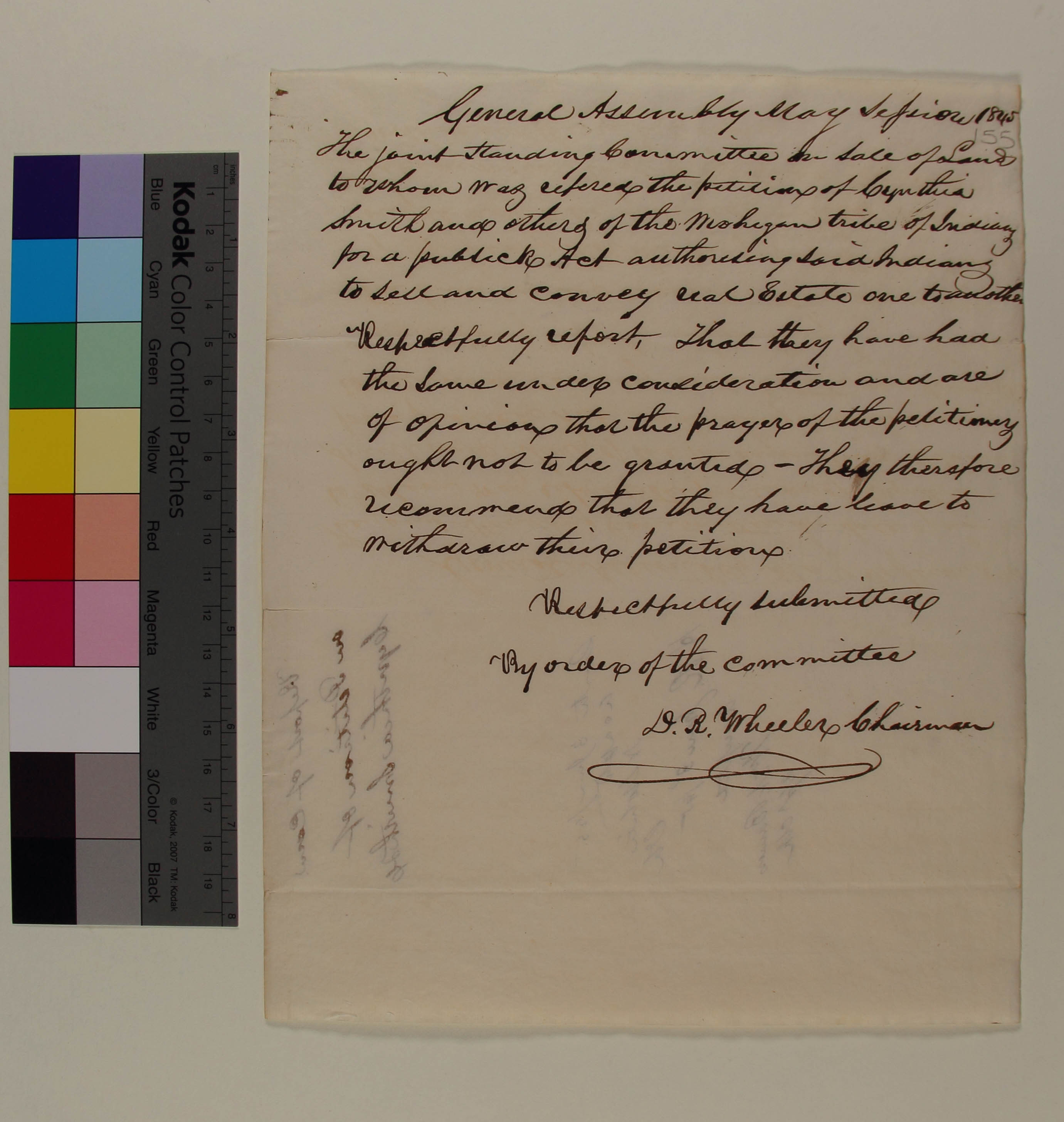 Government -- State -- Connecticut -- General Assembly -- Committee; Land -- Conveyances -- Sale -- Request; Land -- Reservation/Reserve -- Mohegan; Law -- Legislative Process -- Petitions -- Rejected; YIPP -- State of Connecticut Collection, 1784-1869