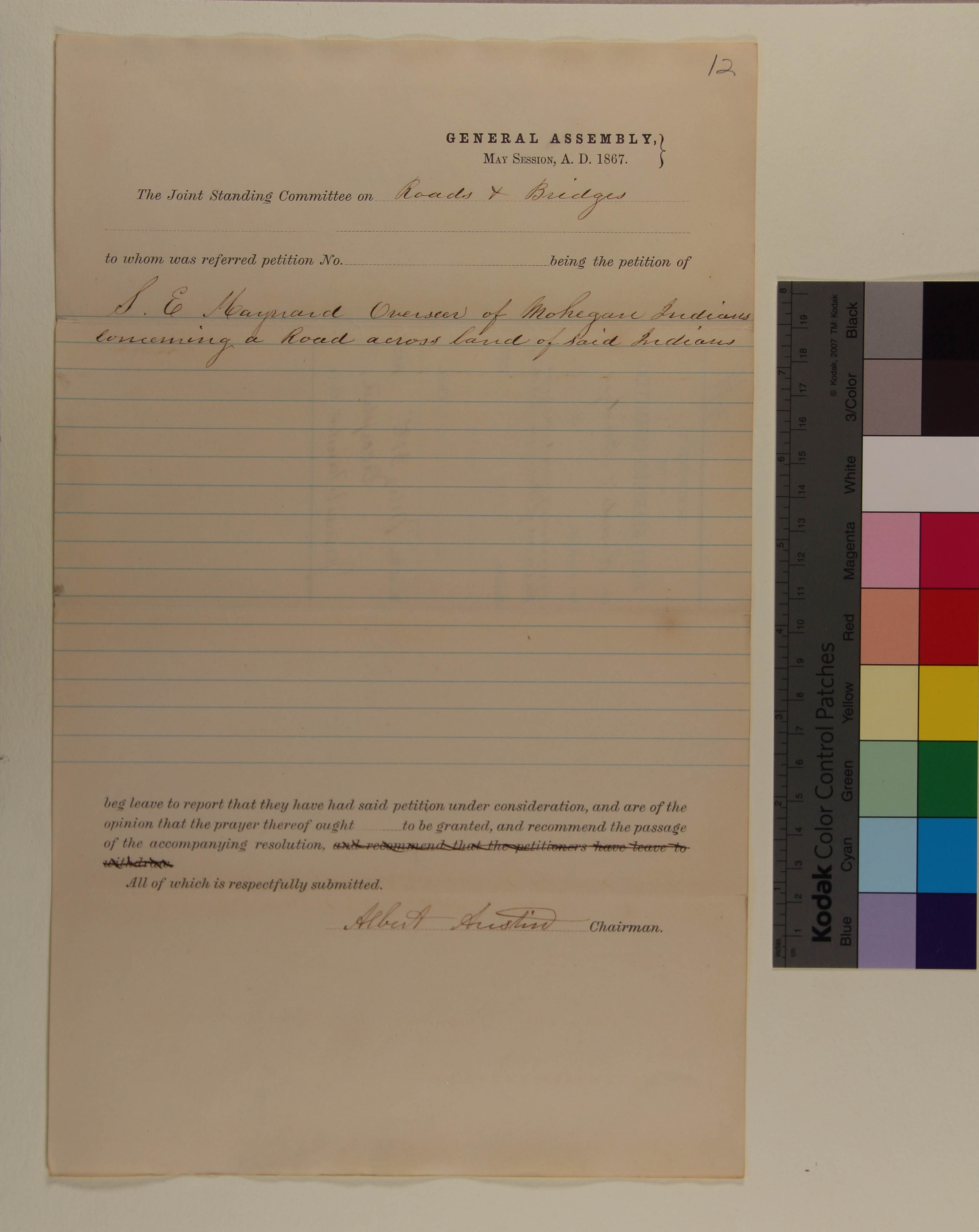 Report of the Joint Standing Committee on the Petition of S.E. Maynard, Overseer for the Mohegan Indians, to the Connecticut General Assembly concerning a Road across Mohegan Lands